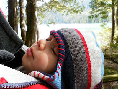 Le petit passager a passé sa première nuit sous la tente ! Il faisait encore frisquet alors nous l'avions bien emmitouflé ! La nuit, nous avons entendu le hululement caractéristique des Grands Ducs et toutes sortes de bruits produits par les animaux nocturnes. Un écureuil est même venu faire ses dents sur les chaussures du geek ! Au petit matin, la brume donnait une atmosphère mystique au lac et le cri d'un huard solitaire venait percer le silence. (écoutez ce cri ici) Manque de bol, le petit passager avait un petit virus qui a fini par se manifester et n'était vraiment pas au mieux de ma forme... Nous avons donc décidé de plier le camp plus vite que prévu et battu des records de vitesse pour refaire la randonnée en sens inverse.